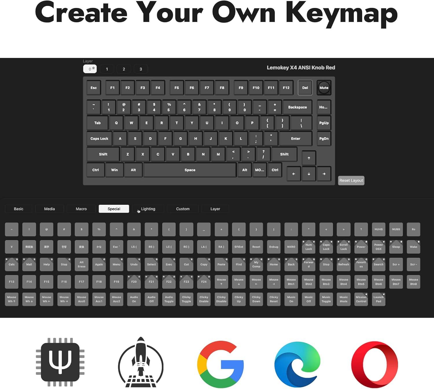 Create Your Own Keymap – Customization with the Lemokey Launcher web app, drag and drop your favorite keys or macro commands to remap any key on any system (macOS, Windows, or Linux) maximizing your game performance. Or create your keymap with open-sourced QMK firmware.